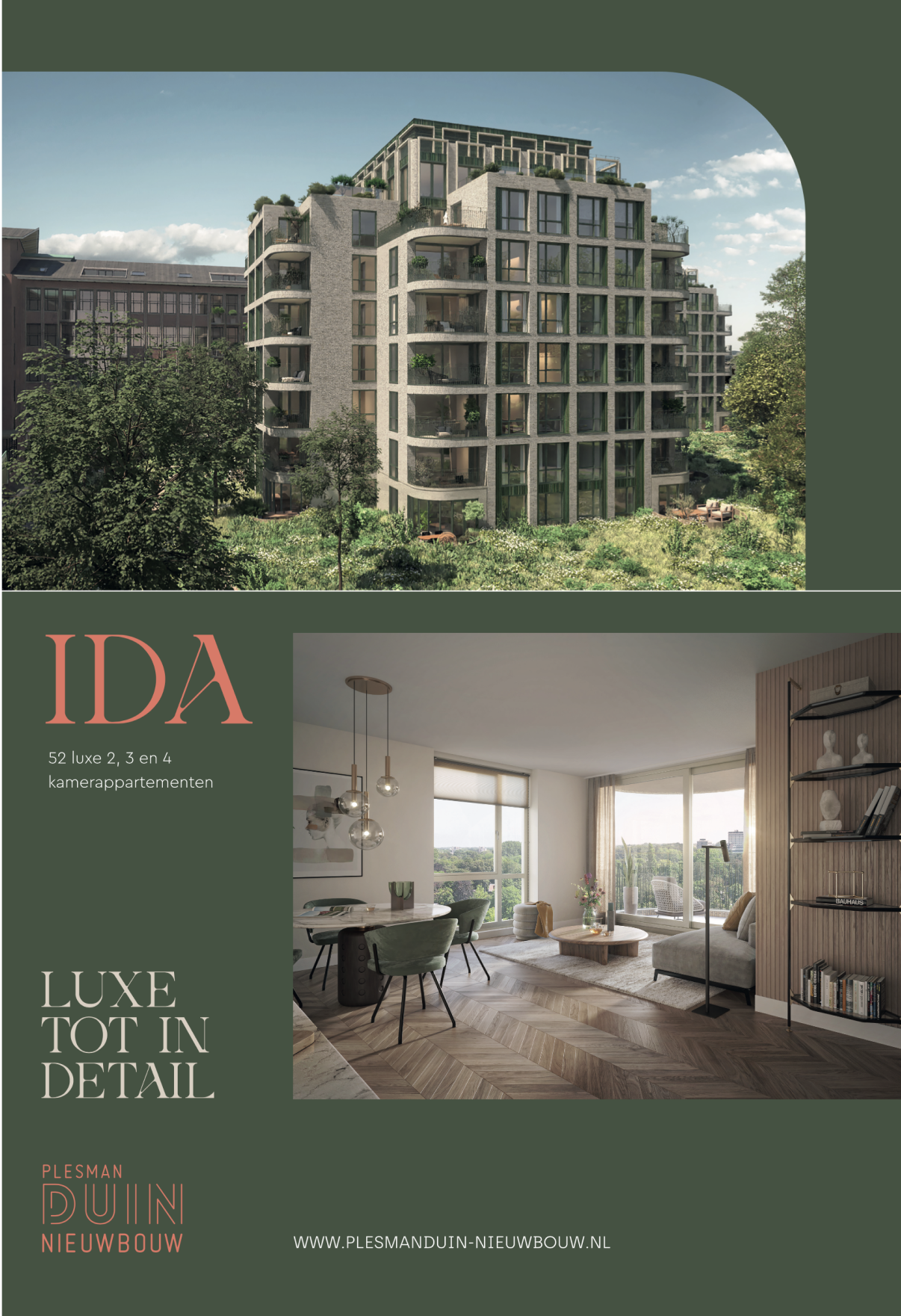 Modern wonen in een parkachtige omgeving. Midden in de stad én volop groen voor de deur. Heerlijk struinen in de duinen, in het bos of uitwaaien op het strand van Scheveningen. Net zo gemakkelijk: een espresso halen om de hoek, een hapje eten in de buurt en shoppen in een van de chique winkelstraten van Den Haag. Of gewoon lekker luieren op uw ruime terras. Plesmanduin Nieuwbouw bestaat uit hoogwaardige afgewerkte en comfortabele appartementen op een monumentale locatie in Den Haag. Uniek gelegen tussen stad en strand. Deze kernwaarden staan aan de basis van een merkbeleving en aanvullende visuele beeldtaal die luxe ademt voor een jongere en oudere doelgroep. Van logo(s) tot website en social activatie.